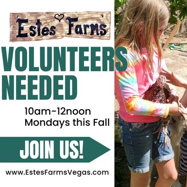 Estes Farms Vegas is open for tours via reservation, depending upon availability. Program and Event hours are listed on the Programs and Events Page on this website, and on our google calendar. Estes Farms is open weather permitting, and may cancel due to inclement weather or illness. Closures, holidays, and special events will be listed on the calendar, the Events page, and social media, and is otherwise open during listed hours.